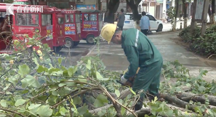 河池市大部地区出现大雨、局部暴雨到大暴雨,并伴随7级及以上阵风。宜州区部分乡镇出现冰雹,全市11个县(区)均遭受7级及以上阵风侵袭。贺州市昭平县再次出现强对流天气,城区部分街道路段突发大树倒塌险情。工作人员手持油锯、绳索等工具,对大树进行切割扶正等作业,保障群众和车辆安全出行。